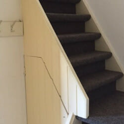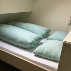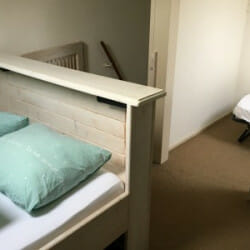 Vloerbedekking, 1 persoons dekbedden, de bedden zijn opgemaakt.